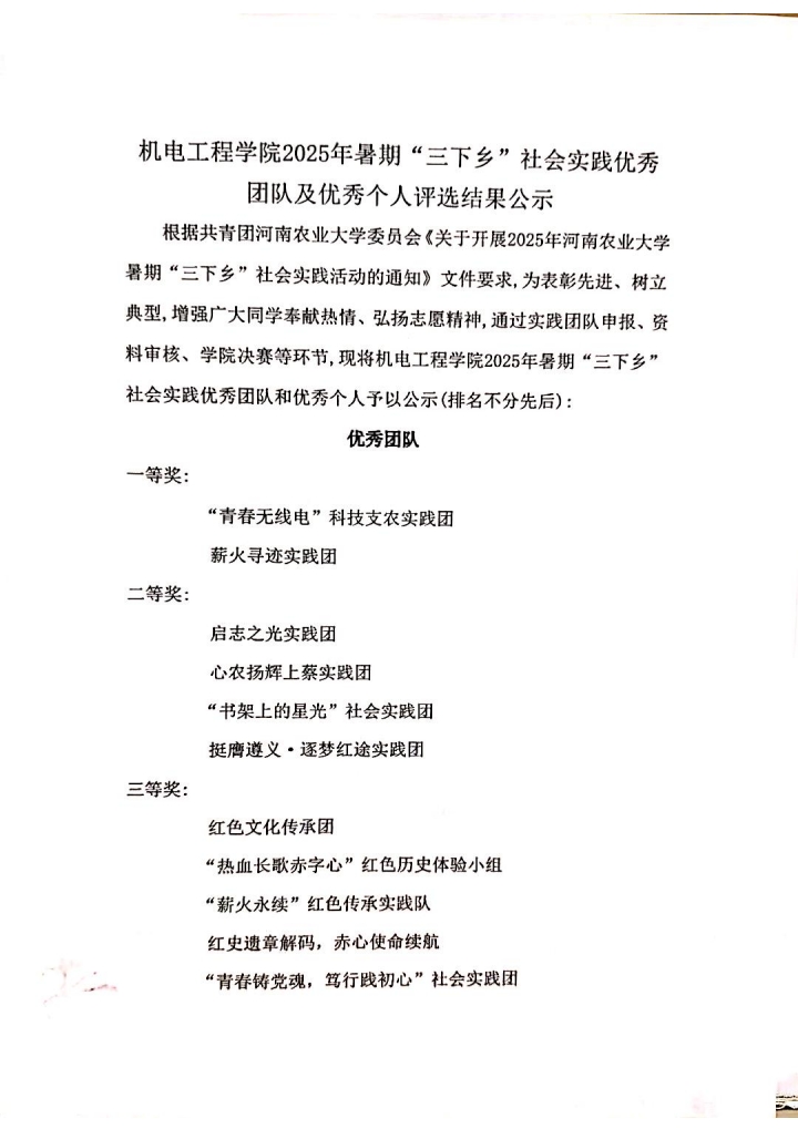 根据共青团91猫先生 委员会《关于开展2025年91猫先生 暑期“三下乡”社会实践活动的通知》文件要求,为表彰先进、树立典型,增强广大同学奉献热情、弘扬志愿精神,通过实践团队申报、资料审核、学院决赛等环节,现将91猫先生 2025年暑期“三下乡”社会实践优秀团队和优秀个人予以公示(排名不分先后):